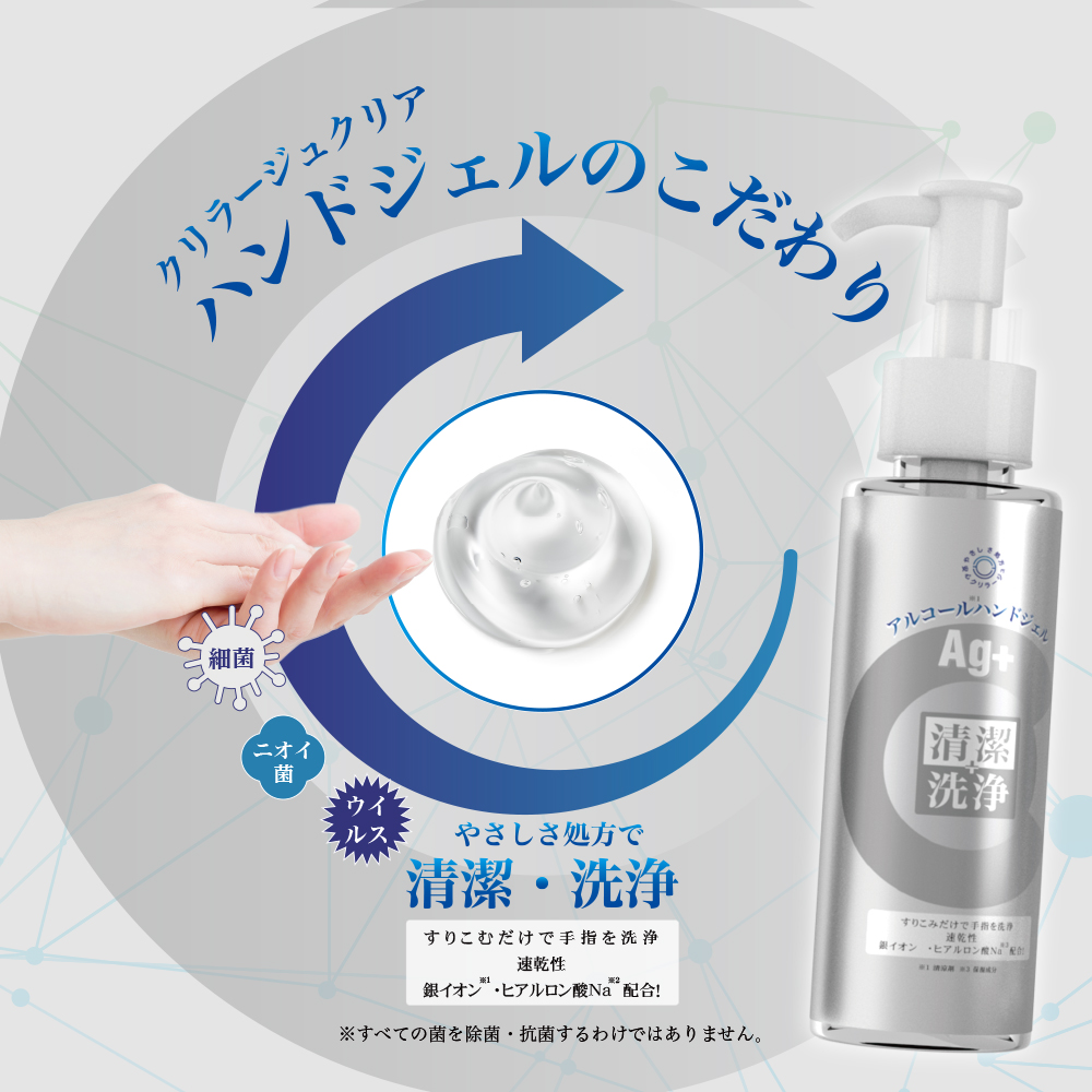 アルコール除菌で気になるのは何といっても手指の乾燥。 何度も使用することでアルコールの揮発性により手指が乾燥してしまいます。 そんな手指のことを考え、クリラージュクリアのハンドジェルは手指が乾燥しにくい特別なテクスチャーになっています。 手指が乾燥しあかぎれてしまうと、そこから菌やウイルスの侵入を許してしまうことがありますので、そんな手指のことも考えた処方にたどり着きました。